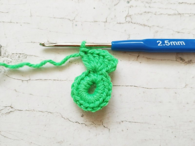 Затем вяжем 1 ст\без\нак в вп нижнего ряда. Далее 2 вп и 1 ст\без\нак во 2 воздушную нижнего ряда.
