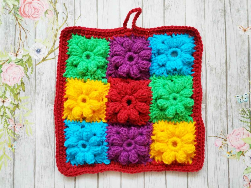 Вязать прихватку можно и нитью одного цвета, но разноцветные мотивы придадут изделию яркости.
