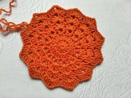 Пряжу можно использовать любую, но не тонкую. Иначе салфетка-подставка получится очень маленькой и будет сильно сминаться.