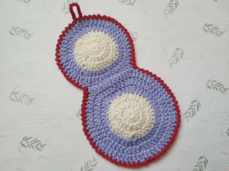 Осталось украсить прихватку. Ниткой, которой делали обвязку, набираем 5 петель и замыкаем в кольцо. Вяжем 4 петли и 1 сбн. Повторяем 4 раза. получим 5 арок. Внутрь каждой арки провязываем по 5 сбн.