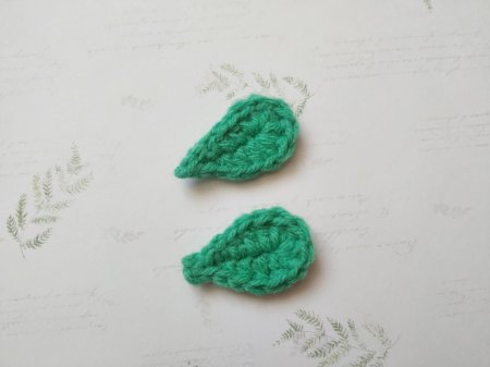 Свяжем 2 листочка зеленой ниткой. Набираем 7 петель. Вяжем 2 сс, затем 2 сбн, далее 1 пссн. Дальше в 1 петлю (крайняя) вяжем 5 пссн. По другой стороне вяжем так же, только в зеркальном отражении.