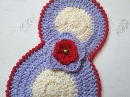 Далее под эти арки нитью основного цвета вяжем 2 сбн, 2 пссн, 1 ссн, 2 пссн, 2 сбн. По центру пришиваем бусинку и прикрепляем цветок к прихватке.