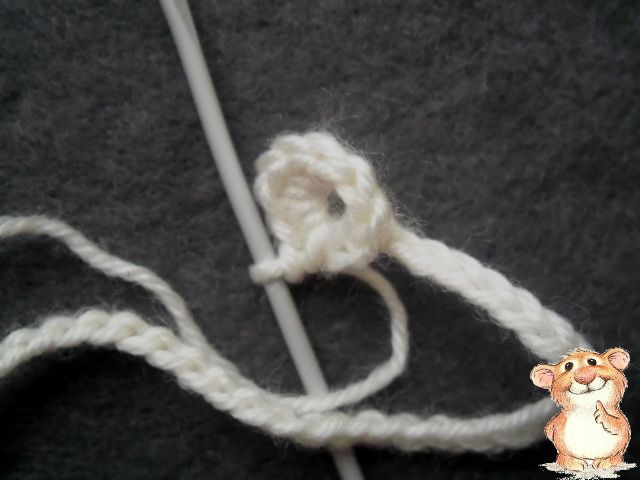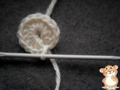 Отсчитываем назад 5 воздушных петель и замыкаем в кольцо при помощи соединительного столбика, вот так:1 ряд: под кольцо из воздушных петель провязываем 10 столбиков без накида.