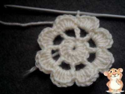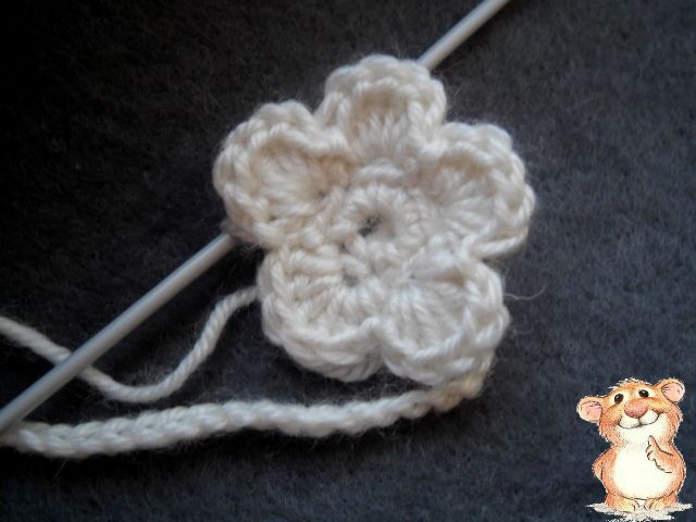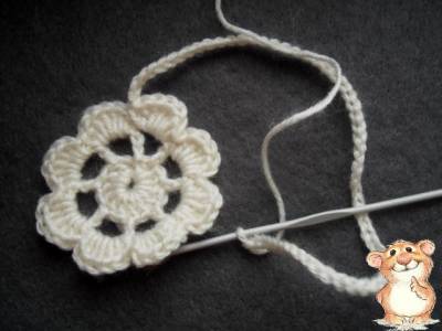 2 ряд: 1 воздушная петля, в следующую петлю предыдущего ряда провязываем * 5 столбиков с одним накидом, соединительный столбик в петлю предыдущего ряда **, повторяем вязание до конца ряда. Получается 5 лепестков.