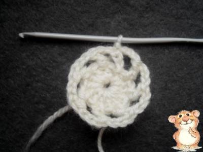 3 ряд: под каждую арочку из 3 воздушных петель предыдущего ряда провязываем лепестки * столбик без накида, 5 столбиков с одним накидом, столбик без накида **; повторяем от * и до ** до конца ряда – всего 8 лепестков.