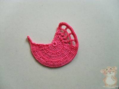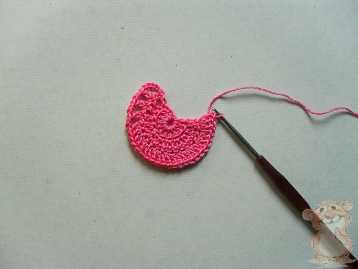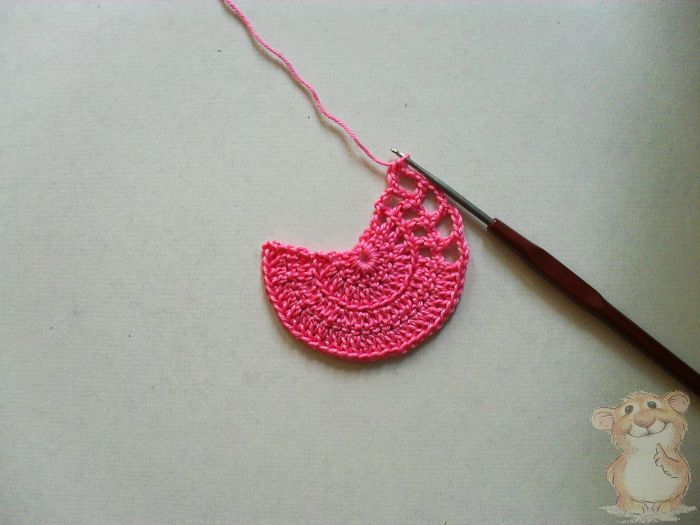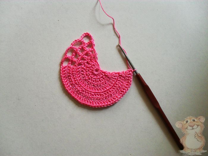 Снова петли подъема и поворот. Делаем прибавки, провязывая по два столбика с накидом в одну петлю основания. Расстояние между ажурными столбиками в каждом ряду увеличивается на 1 воздушную петлю.
