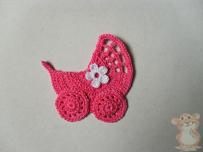 Набираем 6 воздушных петель, поворачиваем вязание и провязываем ряд столбиков без накида. Набранные в начале ряда петли формируют ручку коляски. Заканчиваем обвязку дойдя до центра, где фиксируем нить.