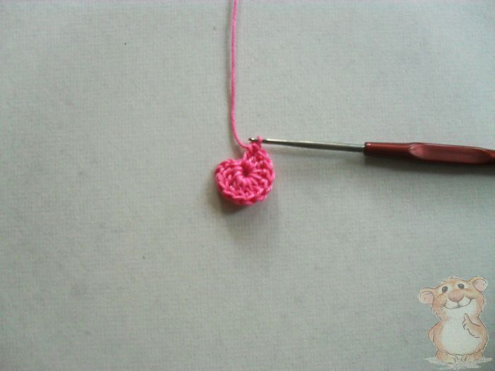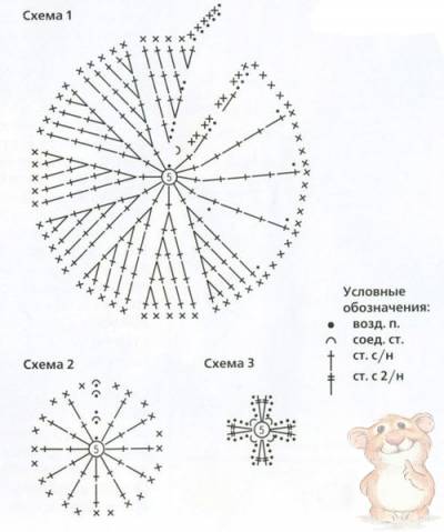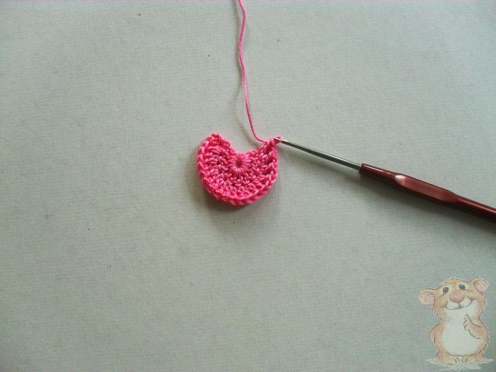 Эта аппликация создается на основе круга, и выполнена поворотным вязанием. В работе использована хлопковая пряжа 50/169м, диаметр готовой аппликации около 10 см.В соответствии со схемой делаем кольцо из воздушных петель для 12 столбиков с накидом, которые по окончанию вязания ряда не смыкаем.