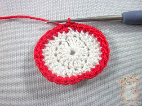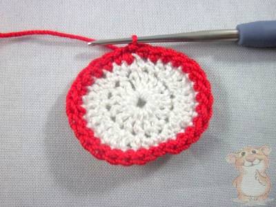 По кругу теперь необходимо провязать столбики так, чтобы получилась слегка овальная форма. Для этого условно делим яблочко пополам. В первые из 8 петель проводим такую последовательность: