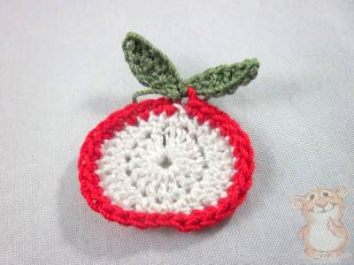Маленькие и незатейливые аппликации, связанные крючком, могут выручить маму во многих интересных ситуациях. Небольшая дырочка на любимых штанишках и кофточке может замаскироваться под такой аппликацией. При изготовлении каких-либо развивающих игрушек такие аппликации могут сгодиться для составления общей композиции странички развивающей книжки или же для стороны развивающего кубика.Здесь представлен процесс изготовления несложной аппликации в виде яблочка, а точнее его половинки. Для работы над этой половинкой яблочка понадобится подготовить пряжу соответствующих цветов и крючок.