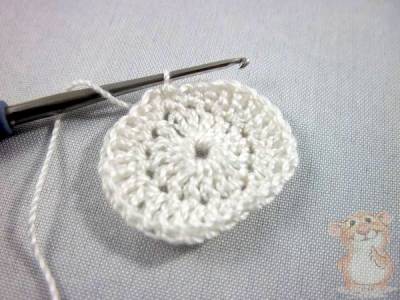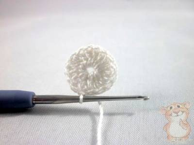 Теперь необходимо в пространство внутри получившегося колечка провязать 15 столбиков с 1 накидом (ССН), а в самом начале ряда сделать для подъема 3 ВП. Далее в конце ряд завершается 1 СП, а в дальнейшем и все следующие ряды будут завершаться так же.
