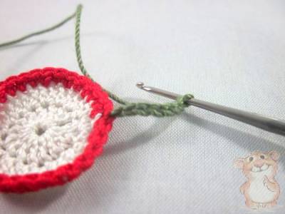 Итак, переходим к изготовлению яблочка и вначале необходимо из цепочки 5 воздушных петель (ВП) собрать колечко. Для этого понадобится в первую петельку цепочки провести 1 соединительную петлю (СП).