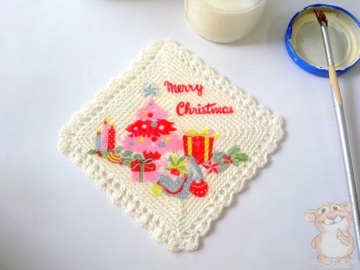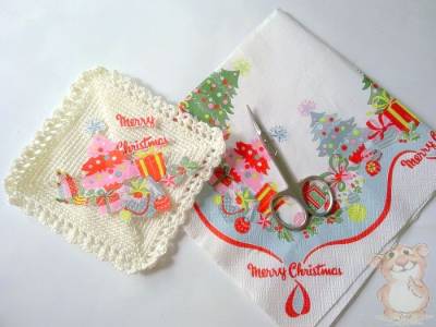 Связанную подставочку разглаживаем, вырезаем понравившийся фрагмент из салфетки, отделяем слой с изображением.
