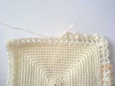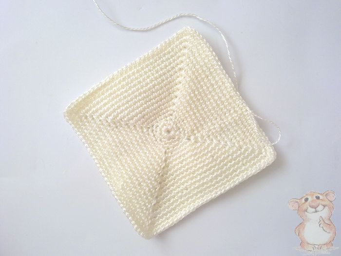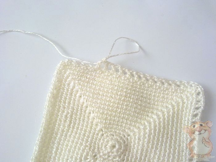3-й ряд - делим вязание на 4 части. По каждой стороне квадрата в угловых столбиках вначале и в конце ряда делаем прибавление одной петли. С каждым новым рядом количество петель по одной стороне увеличивается на две петли. Всего вяжем 16 рядов.