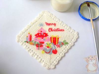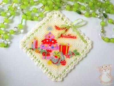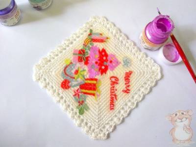 Подбираем по цвету краски (тоже для ткани) и расписываем поверх рисунка. Золотой краской рисуем ореол, чтобы наша ёлочка светилась. Продеваем атласную ленточку между столбиками второго ряда обвязки (для удобства приколите маленькую булавку на кончик ленточки), завязываем на бантик.