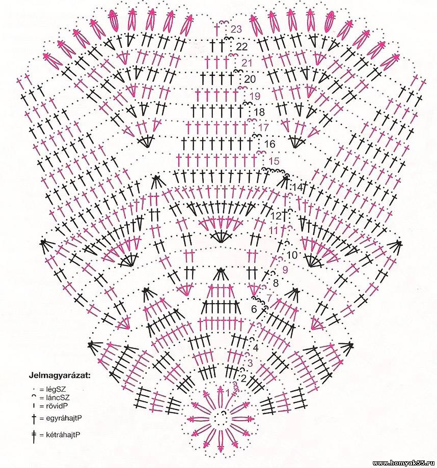 2-й ряд: 2 СС вдоль арки из ВП предыдущего ряда, 3 ВП подъема (вместо первого ССН), 3 ССН в ту же арку, 2 ВП, *4 ССН в следующую арку из ВП предыдущего ряда, 2 ВП*, повторить *-* ещё 10 раз. Ряд закончить СС в 3-ю ВП подъема.