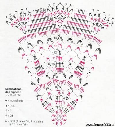 2-й ряд: СС в следующую ВП, 3 ВП подъема, 2 ССН в ту же арку из ВП предыдущего ряда, 2 ВП, *3 ССН в следующую арку из трёх ВП предыдущего ряда, 2 ВП*, повторить *-* ещё 6 раз, СС в 3-ю ВП подъема. $CUT$