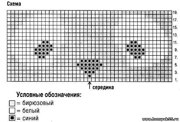 Вам потребуется: пряжа Novita Wool (100% шерсть, 135 м/50 г) - 50 г бирюзового цвета (369), белого (011) и синего (191) цветов, спицы №3, носочные спицы №3.