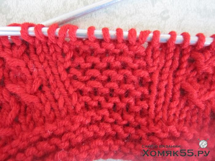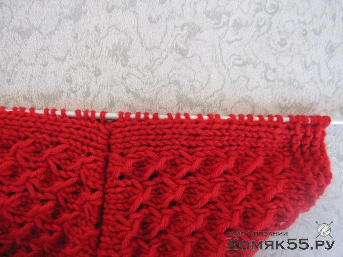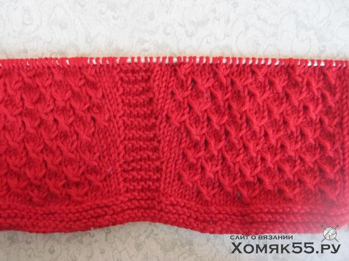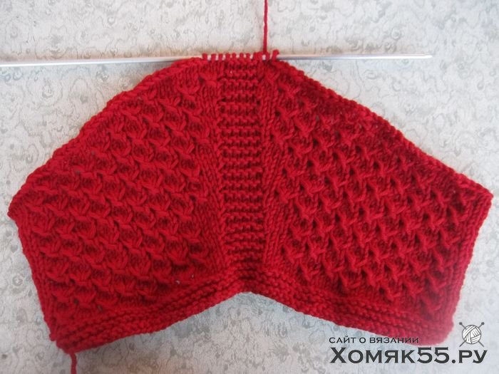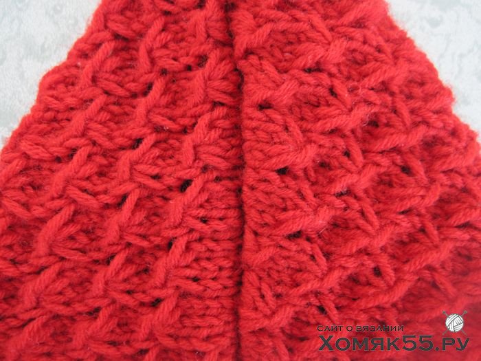 Далее узор повторяется от 2-го до 5-го ряда. Одновременно, начиная с 6-го ряда, в каждом 4-м ряду с обеих сторон от центральной полоски следует делать прибавки.