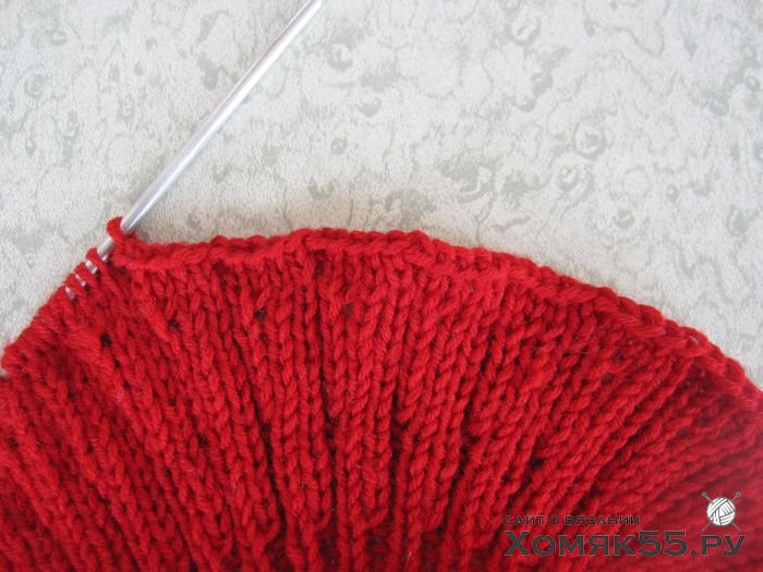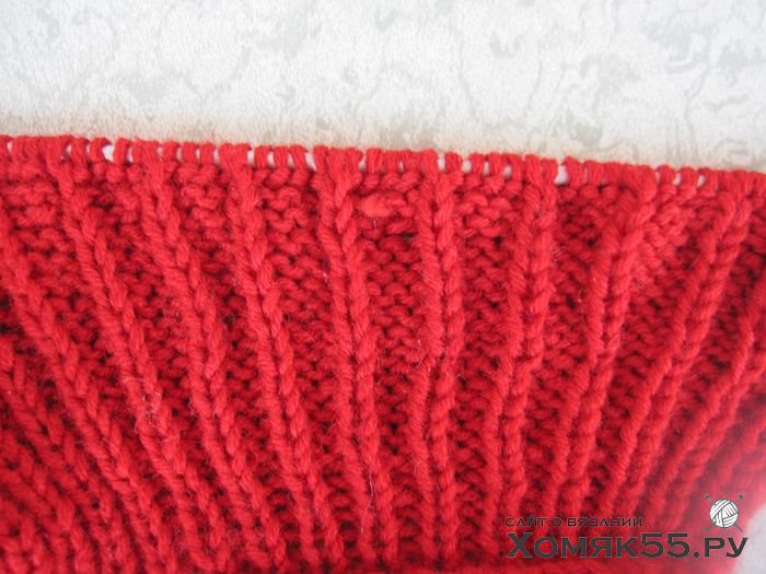 Провязать 6 рядов резинкой 1х1, затем сделать прибавки после каждой изн. п.