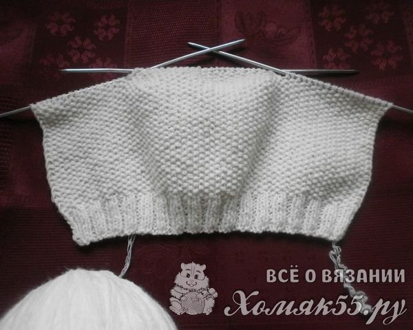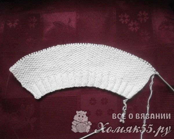 Для вязания берем нить светлого цвета: белую, розовую, голубую. Набираем на спицы 70 петель обычным способом. Вяжем обычной резинкой 2 на 2 (две лицевые петли, две изнаночные), первая и последняя петля – кромочные петли. Резинкой вяжем 10 рядов.