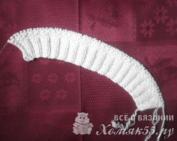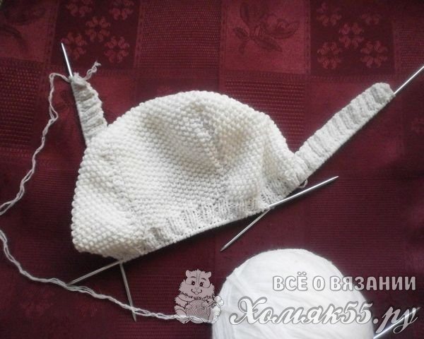 Теперь нам нужно связать нижнюю резинку и тесемки к чепчику. Набираем на спицы 52 петли обычным способом. Еще набираем петли по бокам 27 штук. Дальше идут оставшиеся 12 петель. С другой стороны, тоже набираем такое же количество петель. Всего у нас получается 170 петель. Сами поворозки вяжем изнаночными петлями, а резинку узором 2 на 2 (две петли лицевые, две петли изнаночные).