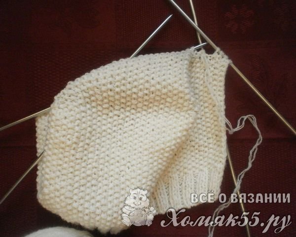 Дальше вяжем донышко для шапочки по принципу пяточки. Теперь распределяем наши петли на 3 спицы. У нас получилось: на боковых спицах по 23 петли, а посередине 24 петли. Провязываем первые 22 петли, а 23 и первую петлю следующей спицы провязываем вместе изнаночной петлей. Провязываем узором следующие 22 петли средней части, а 24 (последнюю) и первую петлю следующей спицы провязываем вместе изнаночной петлей. Разворачиваем наше вязание на изнаночную сторону и опять провязываем узор на средней спице до последней петли. Последнюю петлю средней спицы и первую петлю боковой спицы, провязываем вместе лицевой петлей. Таким образом, с лицевой стороны, две петли вместе провязываем изнаночной, а с изнаночной стороны провязываем две петли лицевой. Вяжем только среднее полотно, а на боковых спицах происходит убавление петель.