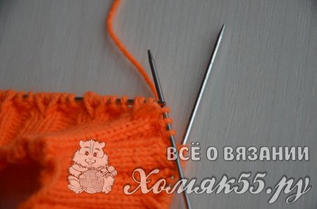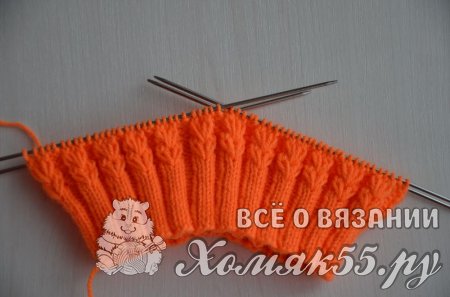 Итак, начинаем с образца. Вяжем основным рисунком квадрат размером 10*10 см., стираем, сушим, определяем плотность вязания. Сделав все вычисления, набираем на спицы необходимое количество петель, оно должно быть кратным пяти. У меня получилось 120 петель, плюс одну петлю для того, чтобы замкнуть вязание в круг.