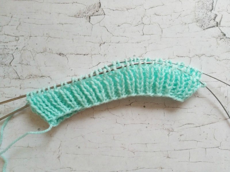 Вяжем резинку 1 на 1 необходимой высоты. Просто чередуем 1 изнаночную петельку и 1 лицевую. И далее будем вязать лицевую петельку в лицевую нижнюю и наоборот – изнаночную петлю вяжем в изнаночную.
