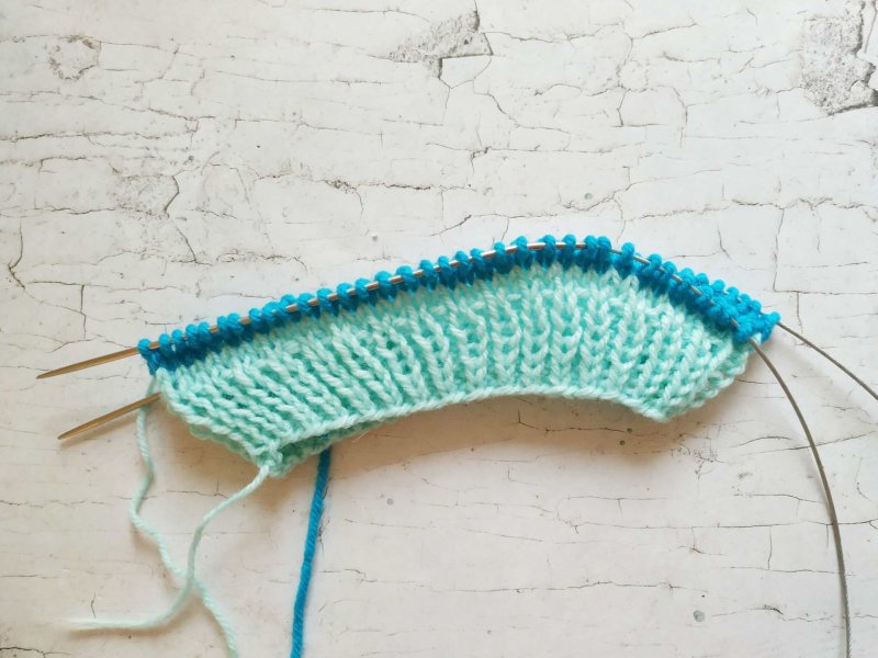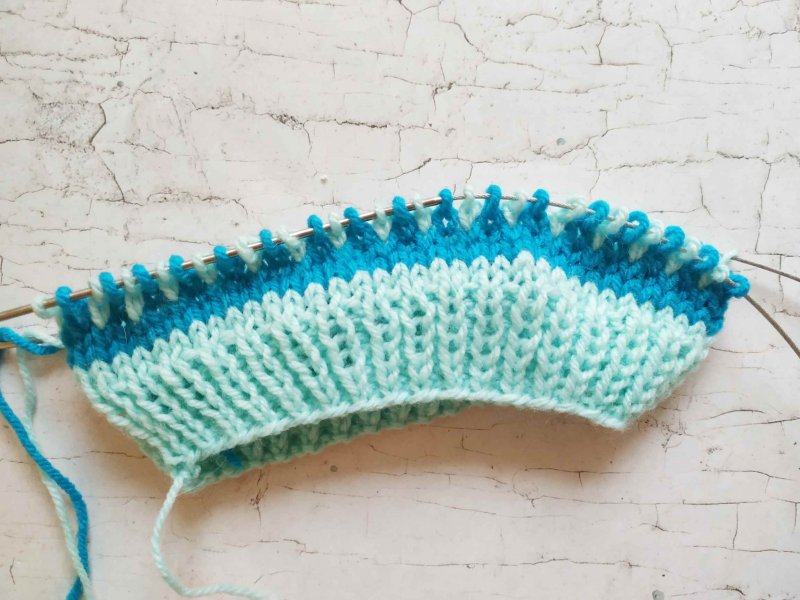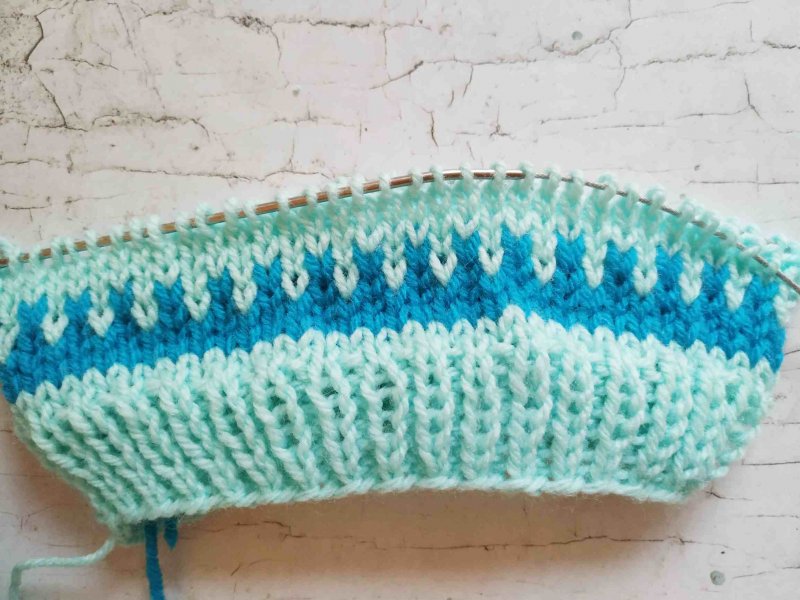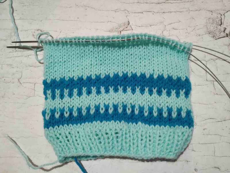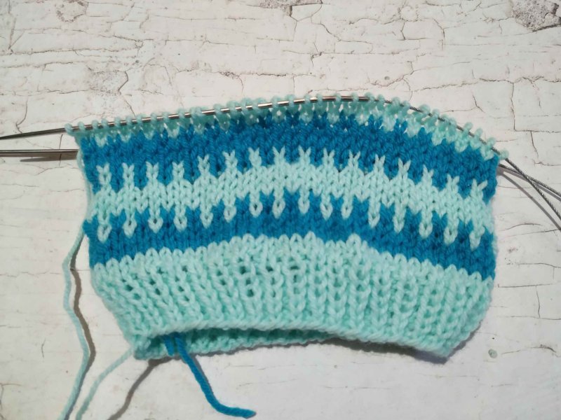 Все дальнейшие ряды вяжем только голубой пряжей. Рисунок закончился. Дальше просто вяжутся ряды лицевыми петельками по кругу.