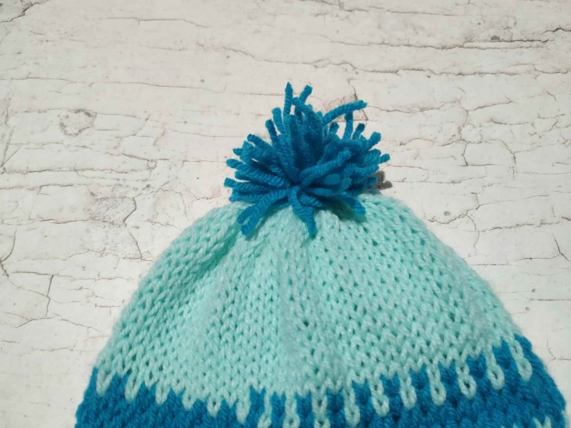 Делаем помпончик из пряжи синего цвета. Просто наматываем на картон пряжу и перевязываем ее посередине. Снимаем с картона и ровняем ножницами.