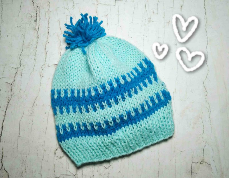 Набираем пряжей голубого цвета петли и замыкаем их в круг для дальнейшего кругового вязания. Количество петель должно быть кратно 2. Их набираем по обхвату головы и плотности вашего вязания.