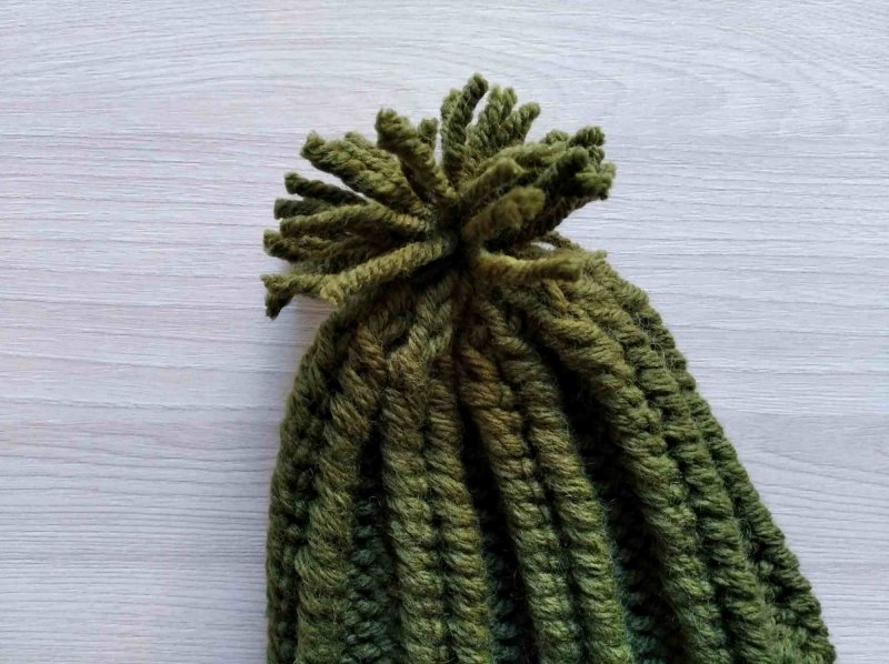 Довязываем шапочку до необходимой высоты и приступаем к закрытию петель макушки.
