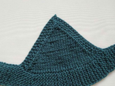 Кромочная. Затем жемчужный край – 1 изн, 1 лиц, 1 изн. Далее убавка лицевой петлей. Затем до последних 6 петель вяжем лицевыми. Убавка. Далее 1 изн, 1 лиц, 1 изн. Кромочная петля изнаночной.