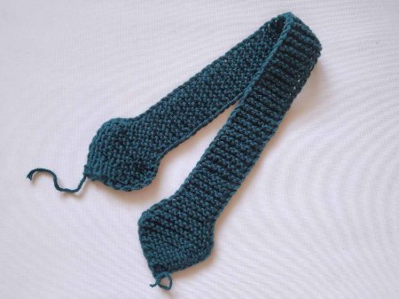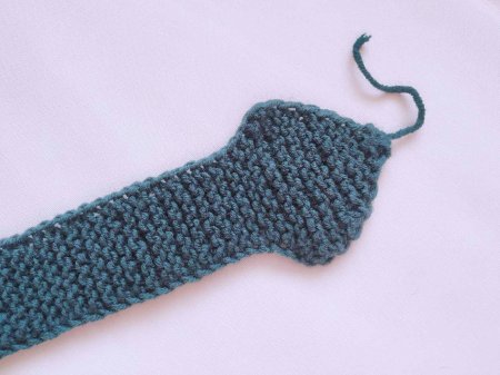 Количество рядов зависит от обхвата головы. При этом добавим еще 10-12 см. Далее вяжем такую же деталь, как в начале. Только наоборот. Теперь 8 рядов, из которых 4 с прибавками, 4 без них. Затем прямо вяжем 2 ряда.