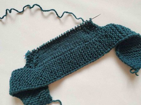 Прибавляем после первой кромочной и перед второй кромочной через 1 ряд. Всего свяжем 7 рядов с прибавками и 7 рядов между ними без прибавлений. И еще 2 ряда без прибавок.