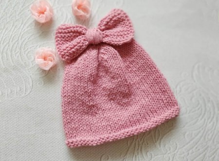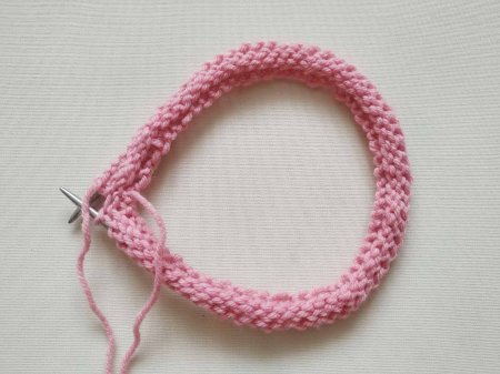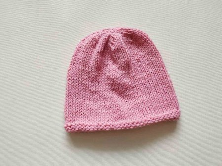 Чтобы связать такую шапку на круговые спицы наберите необходимое для обхвата головы ребенка количество петель. Затем замкните вязание в кольцо и провяжите несколько рядов изнаночной гладью, выполняя в каждом ряду только изнаночные петли. Достаточно 5-6 рядов.