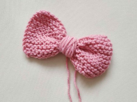 Вяжем поворотными рядами платочной вязкой, провязывая только лицевые в каждом ряду, кроме первой и последней петли. Для ровного края первую петлю просто снимайте, последнюю в каждом из рядов вяжите изнаночной. Количество рядов зависит от высоты банта. Закройте петли.