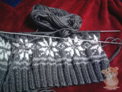 Начинаем вязать жаккардовый узор, для этого используем дополнительную нить белого цвета.
