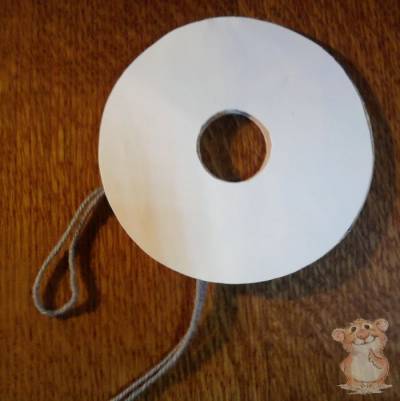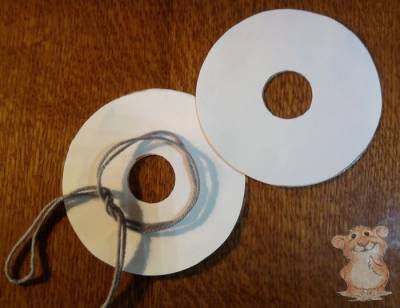 Возьмите лист плотного картона и изготовьте две детали, как указано на рисунке. Проложите между ними нить и соедините детали.