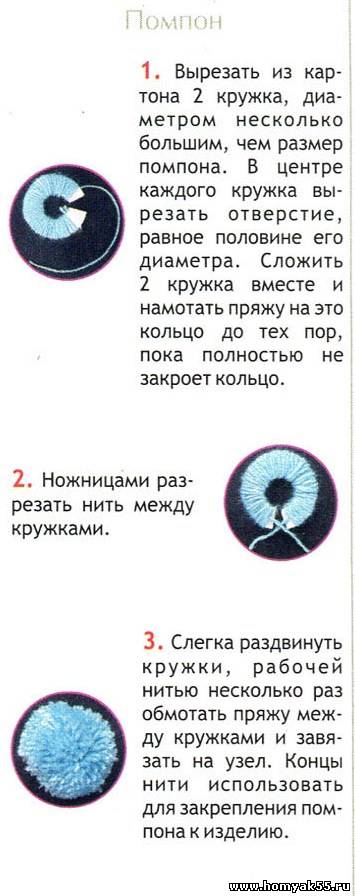 Выполнить шов, учитывая, что нижняя часть отворачивается наружу. Из пряжи белого цвета выполнить 2 помпона (см. рисунок) и пришить к ушкам. Для придания ушкам формы необходимо самую тонкую их часть наполнить синтетической ватой.