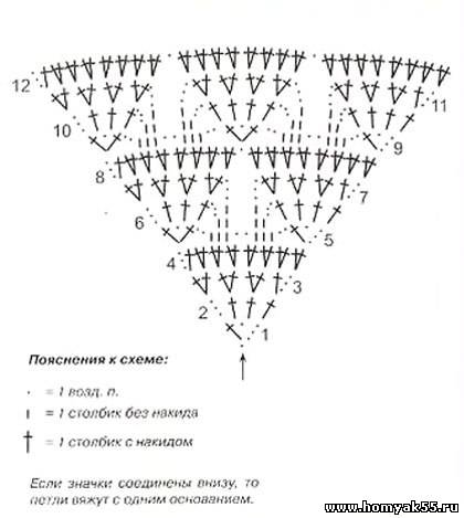 Узор: связать по схеме с 1-го по 12-й ряды, затем повторять 5-12 ряды, соответственно расширяя узор. Вместо 1 петли делать указанное число ВП подъема.