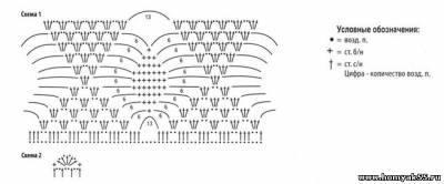 Наберите цепочку из ВП. длиной 45 см и вяжите по схеме 1 полотно длиной 185 см, обвяжите палантин по периметру 2 рядами филейной сетки:*ССН, 2 ВП*. Длинные края палантина обвяжите "ракушками" по схеме 2. Короткие края палантина обвяжите 3 рядами сетки из арок из ВП: *СБН, 8 ВП*, в след. ряду СБН вяжите в середину арки из ВП предыдущего ряда. Украсьте короткие края кистями.