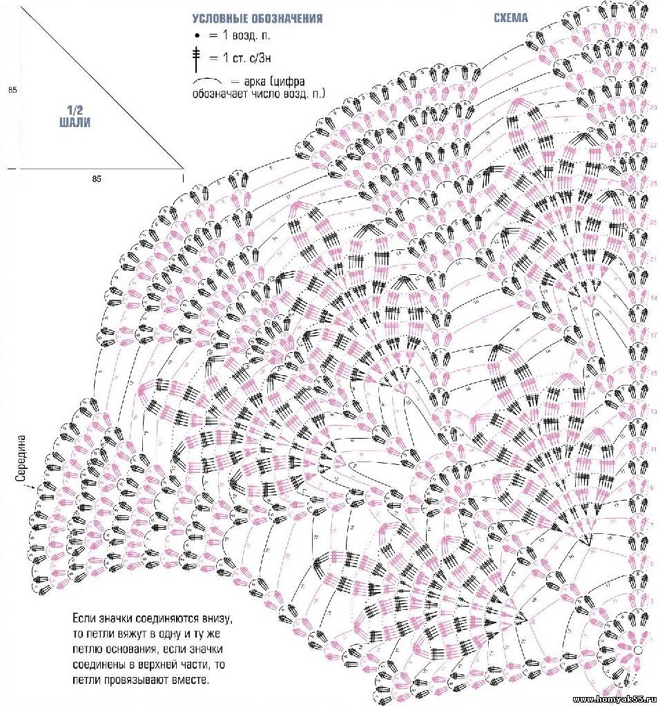 Выполнить начальную петлю и вязать прямыми и обратными рядами по схеме, при этом от середины ряд заканчивать симметрично. Через 85 см = 34 ряда от начала вязания работу закончить. Завязать по краю шали кисти бахромы из 6 нитей длиной 42 см (см. фото).$CUT$