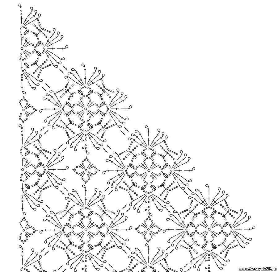Замкните в круг 2-3 ВП полустолбиком и 1 ССН в 3-ю ВП от начала круга. Далее - по схеме. Обвяжите диагональ готовой шали 1-2 рядом полустолбиков.