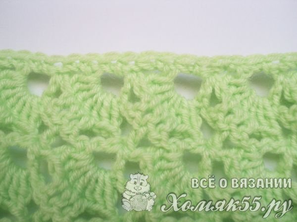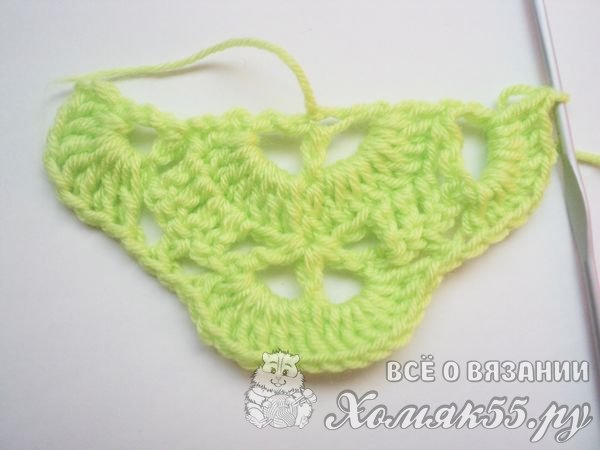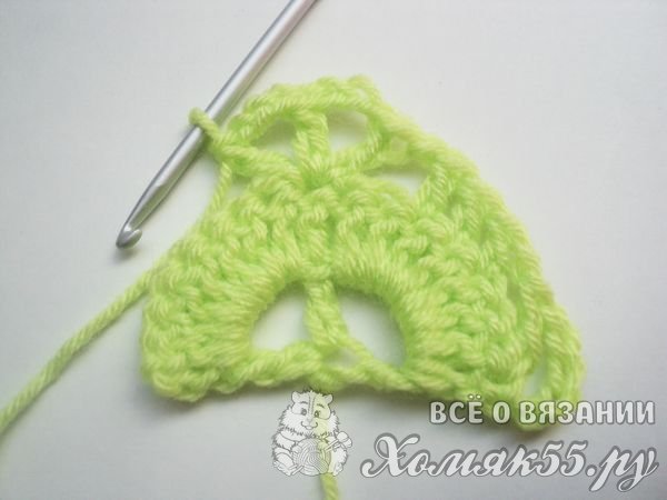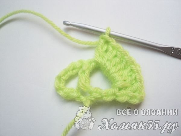 В третью, четвертую и пятую петли выполним по одному ССН. Снова сделаем одну ВП. И в последнюю петельку свяжем ССН, три ВП и ССН.