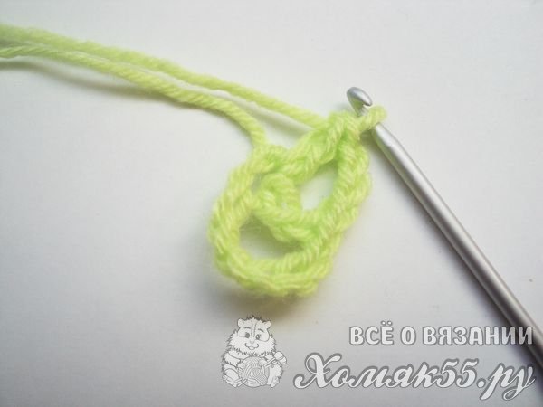 Вяжем семь ВП и в самую первую (начальную) петельку выполняем один ССН. Вяжем три ВП и в то же самое место, куда мы вязали ССН, вяжем еще один ССН.