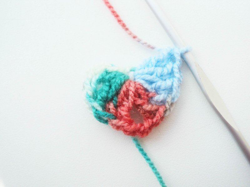 Вяжем еще 4 ст.с.н. И затем набираем 2 возд.п. Вяжем еще 5 ст.с.н. Скользящую петельку после этого затягиваем.