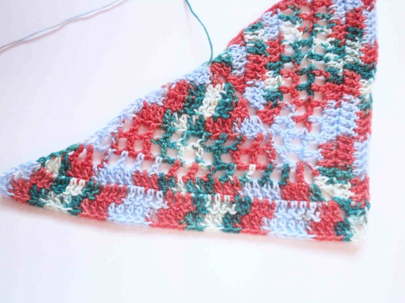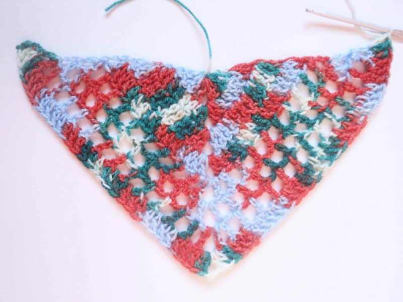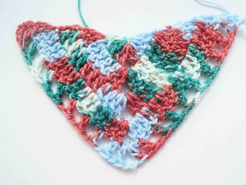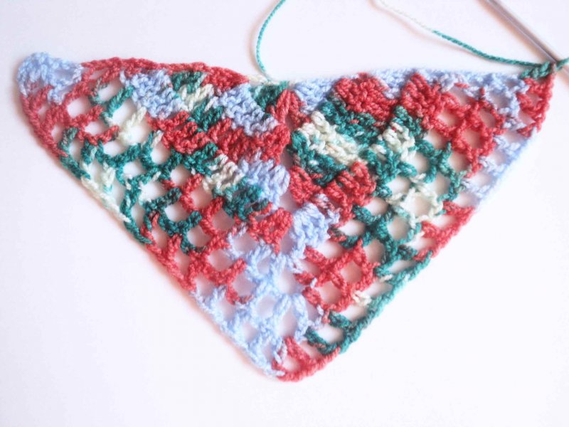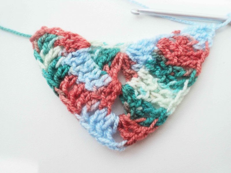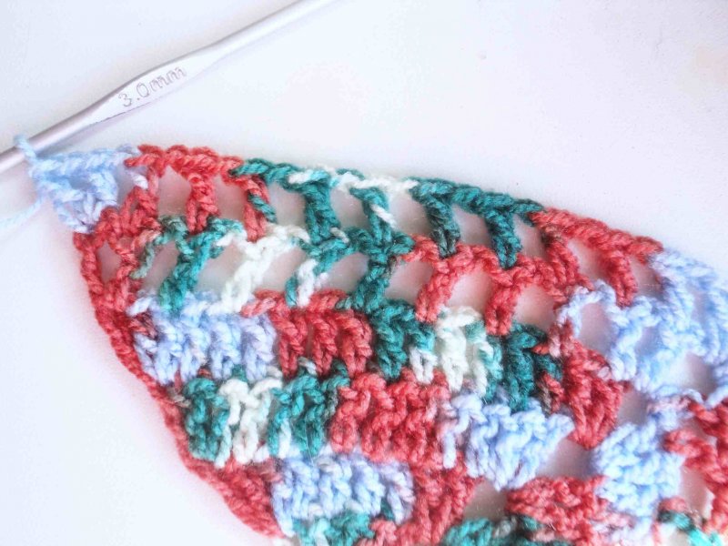 Вяжем далее еще ряд ст.с.н., провязав по 3 столбика в уголках и комбинацию из 2 столбиков, 2 воздушных и 2 столбиков в середине бактуса.
