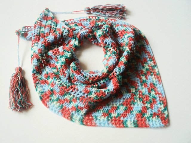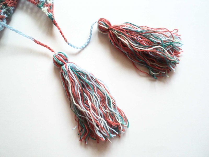 А затем делаем кисточки. Нарезаем пряжу и формируем кисти. Крепим их к бактусу, сделав воздушную цепочку из 25 петель на уголках.